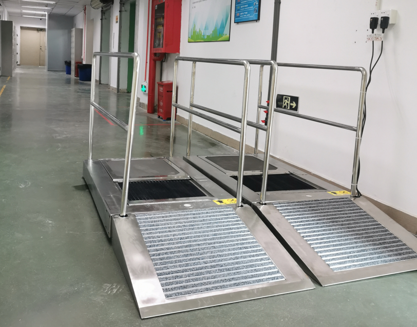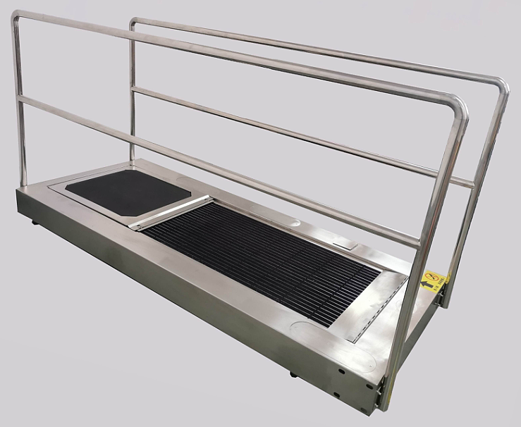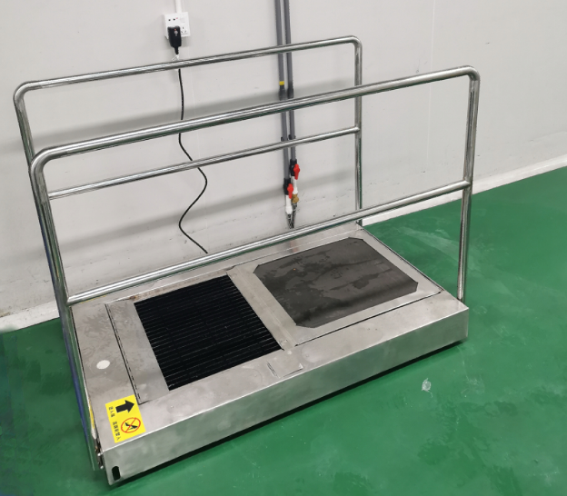 貨淋室:鞋底清洗機(jī)可以嵌入貨淋室地面,人和推車經(jīng)過,清潔鞋底和車輪。