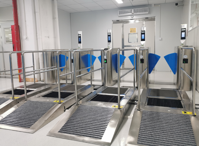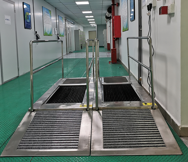 車間入口:鞋底清洗機(jī)放置在車間入口處,風(fēng)淋室前面,清潔完鞋底馬上進(jìn)入風(fēng)淋,阻斷了鞋底污染物進(jìn)入車間的途徑,有效解決車間灰塵污染問題。