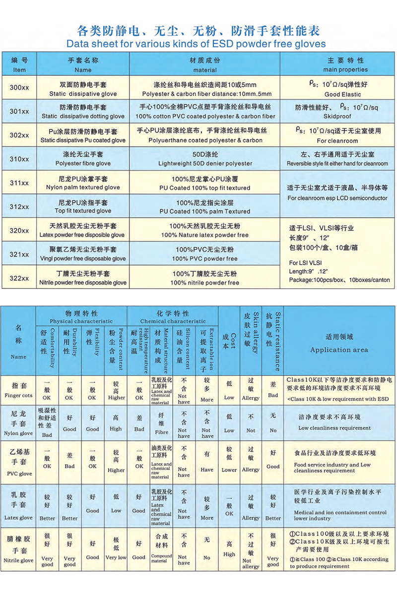 For using gloves in cleanroom, it can ensure the product’s safety, maintain technics and cleanliness. Selecting gloves according to physical & chemical properties of the material and environments.