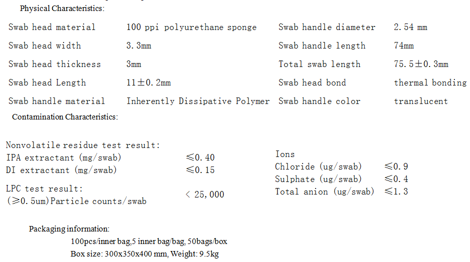 Purestat® ESD swab has good quality and cleaning capability, it is used for cleaning HDD components, optics instrument, medical device, wafer, flat panel displays or vacuum equipment. Its laundered Purestat® swab head construction provides good particle and residue removal Without any abrasion. Unique thermal bonding and cleaning process ensure a minimum of particle shedding from foam seal. The handle is made from a patented Inherently Dissipative polymer to provide clean, permanent ESD protection without contributing particulate contaminates to the cleanroom.