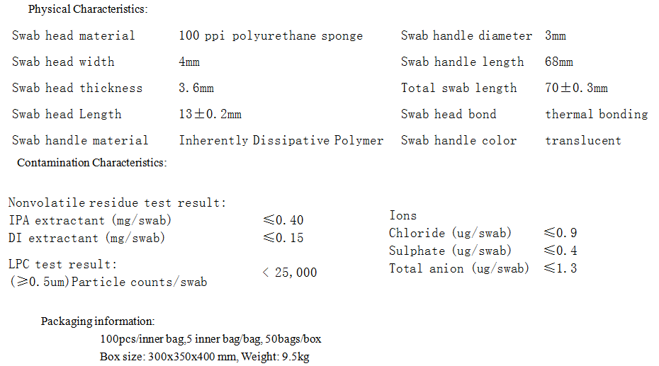 Purestat® ESD swab has good quality and cleaning capability, it is used for cleaning HDD components, optics instrument, medical device, wafer, flat panel displays or vacuum equipment. Its laundered Purestat® swab head construction provides good particle and residue removal Without any abrasion. Unique thermal bonding and cleaning process ensure a minimum of particle shedding from foam seal. The handle is made from a patented Inherently Dissipative polymer to provide clean, permanent ESD protection without contributing particulate contaminates to the cleanroom.